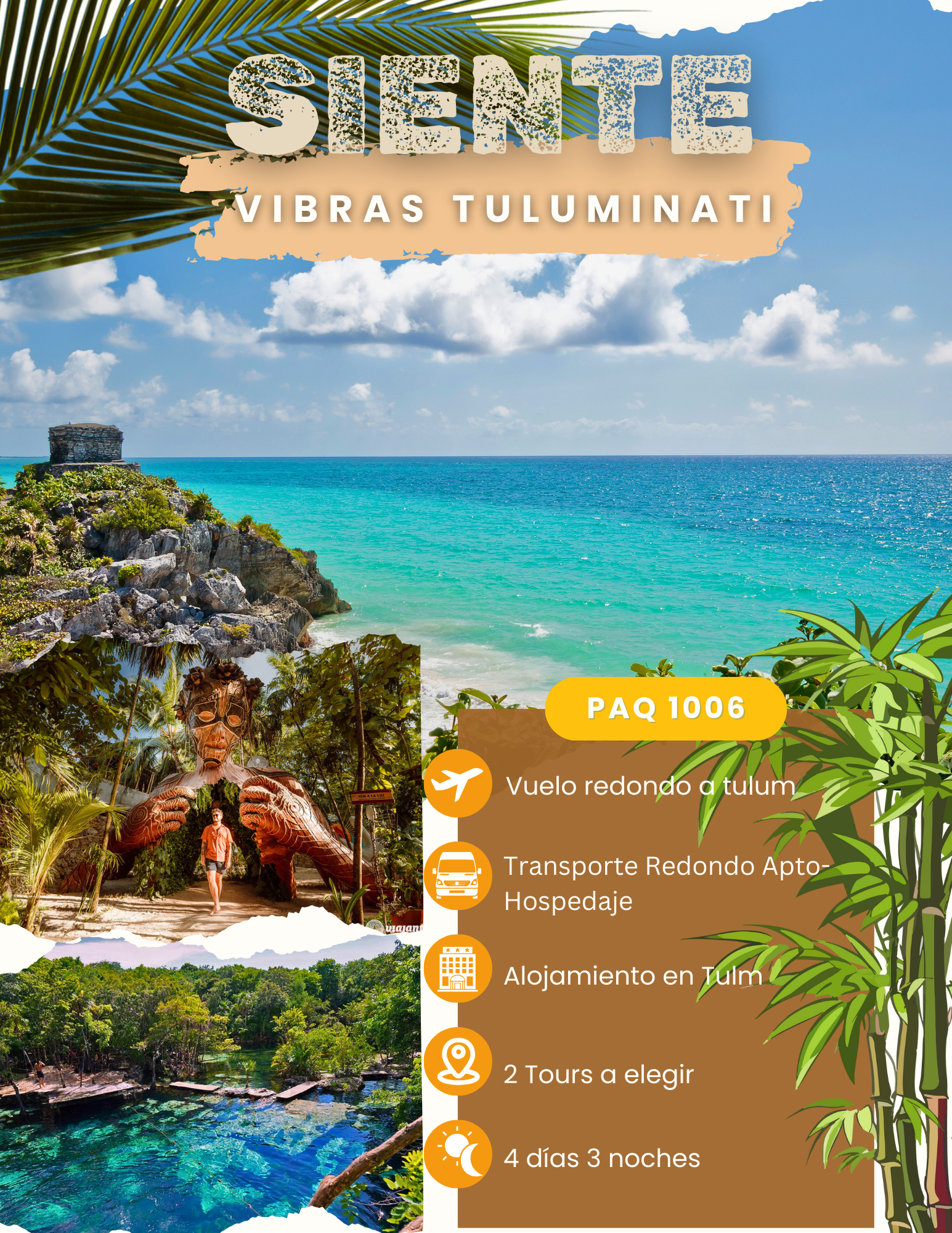 • Paquete descubre Siente vibras tuluminati by Mickmel (Costo por persona en base doble)En este fantástico circuito Descubre Tulum con nuestro paquete,
